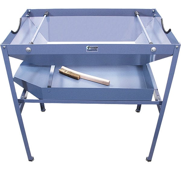 Clean-N-Weigh Accessory provides a fast, convenient method of cleaning and collecting contents of screen trays for weighing of separated fractions. Loaded screen trays are inverted and cleaned on top of the unit and specimen is collected in the included TSA-162 Chute-End Handling Pan below. The pan can also be positioned on an electronic balance for instant display or data collection of cumulative weights. Sturdy, painted-steel construction, adjustable shelf and leveling feet. Dimensions: 30.5×19.5×30.5in (775x495x775mm), WxDxH. Est. Ship Wt.: 63lb (29kg).
