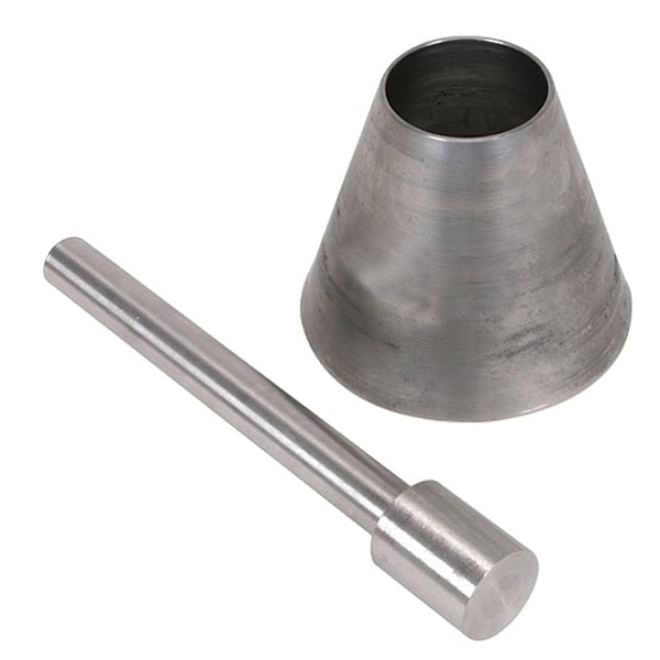 Used for determination of bulk and apparent specific gravity and absorption of fine aggregate. Brass mold is 40mm ID at top, 90mm ID at bottom, 75mm high. Steel tamper weighs 12 oz (340g) and has 1″ dia. (25mm) flat circular tamping face.