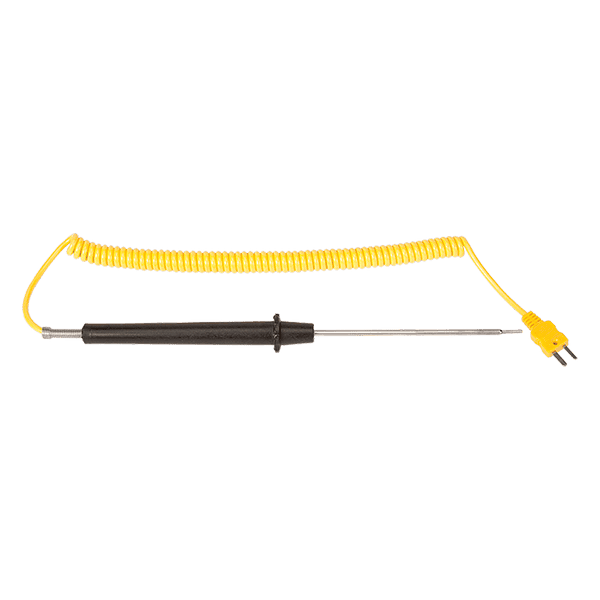 5″ stainless steel probe with 5 ft. PVC coiled cable and Nylon handle. Measurement range: -418 to 1650°F (-250 to 899°C). ASTM-E230-1993. Compatible with K-type measurement instruments.